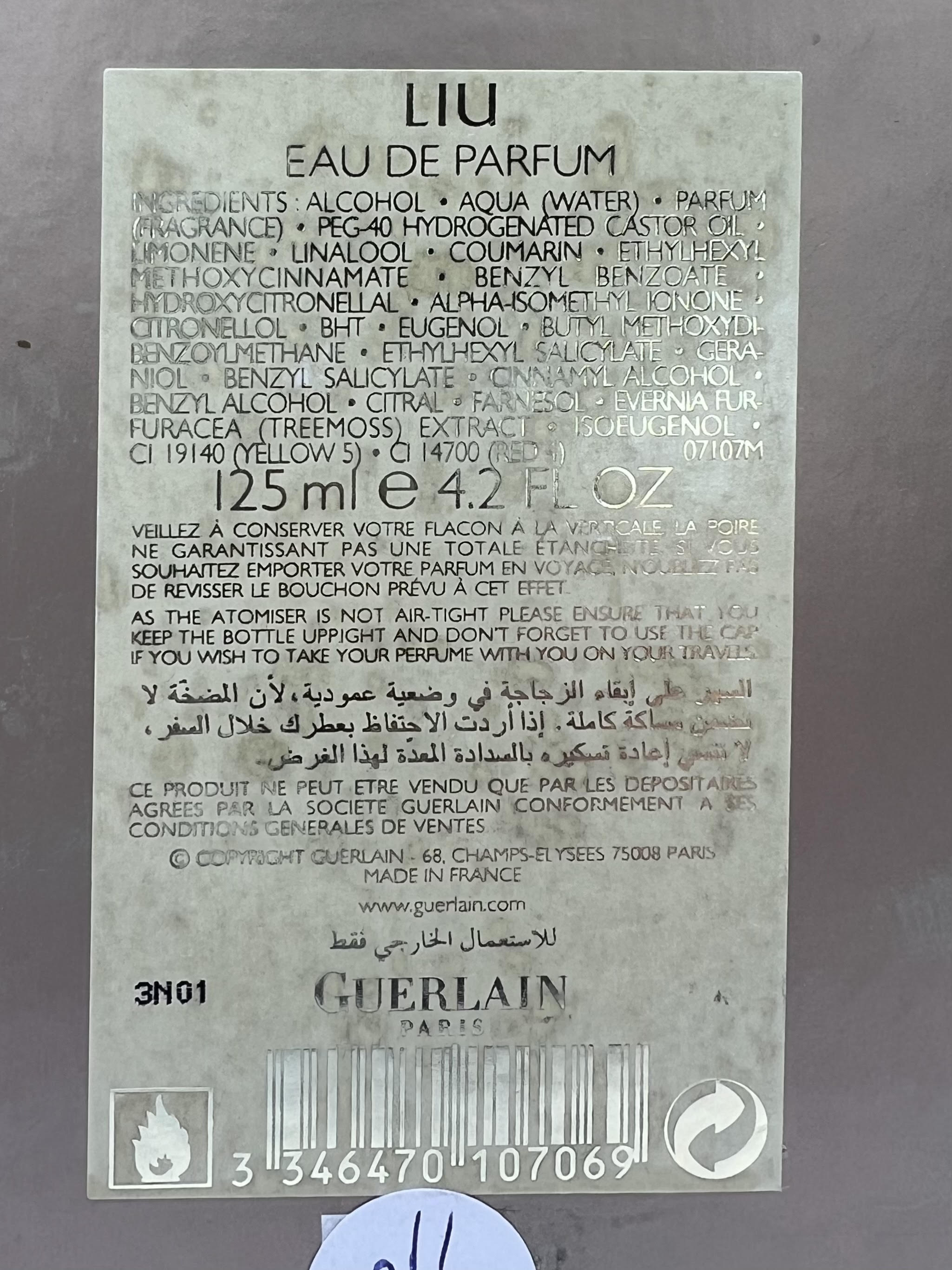 The original formula of Liu was discontinued, before being briefly re-issued in 1994 and 2005 with an altered formula. Finally, it joined the Les Parisiennes Collection, repackaged in the iconic bee bottle. Liu was re-released in 2021 in yet another reformulation. The original Liu, and the reformulation that appears in the Les Parisiennes Collection, both have an aromatic profile of aldehydic, fresh, white floral, woody, citrus, iris, powdery, fresh spicy, aromatic, and floral notes. The currently available version notably lacks the fresh, spicy, and aromatic accords, instead opting for a soapier, earthier, iris and violet combination.