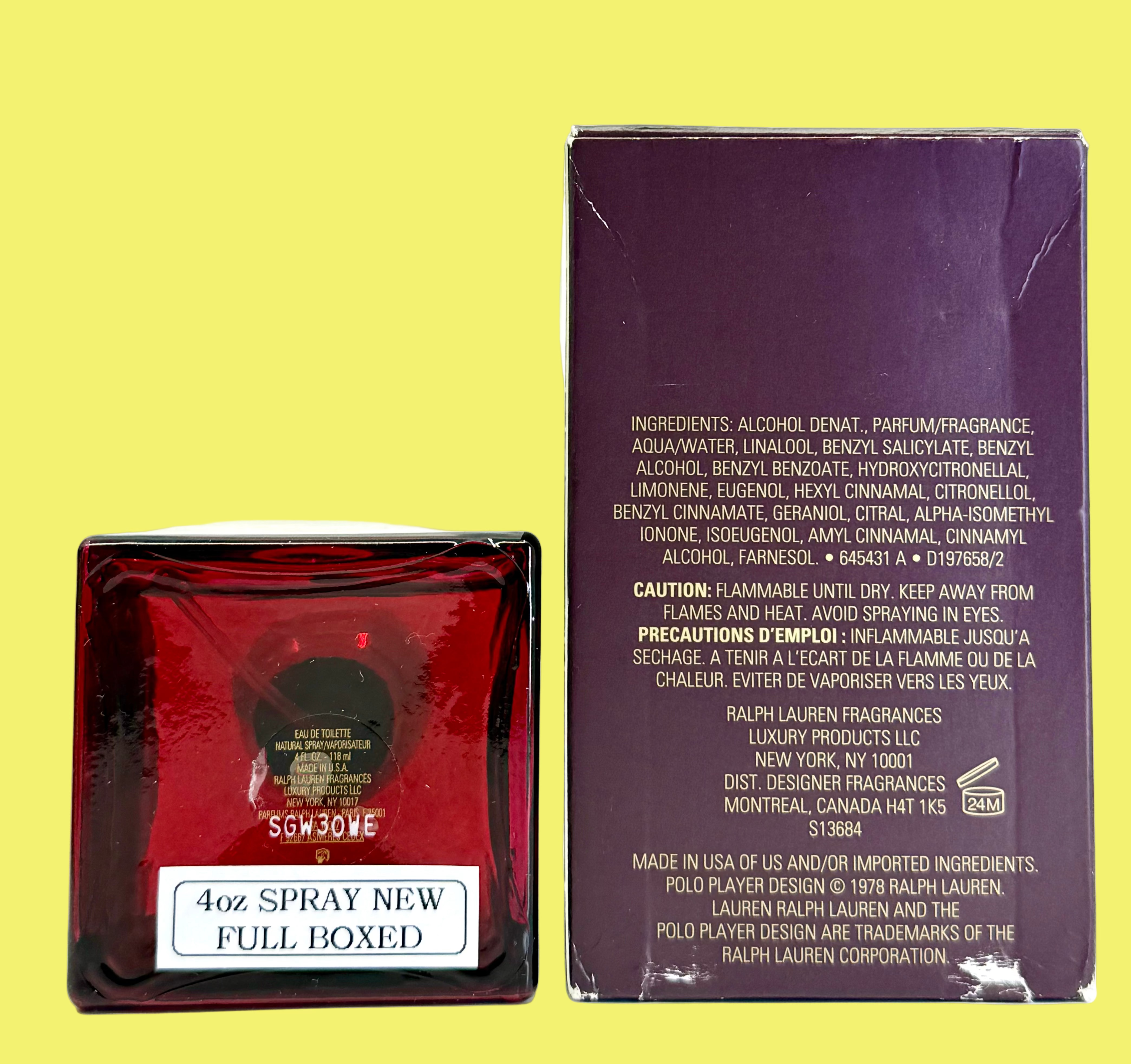 - A full, new, boxed 4oz/118ml spray bottle. Box has wear. Yellow background..