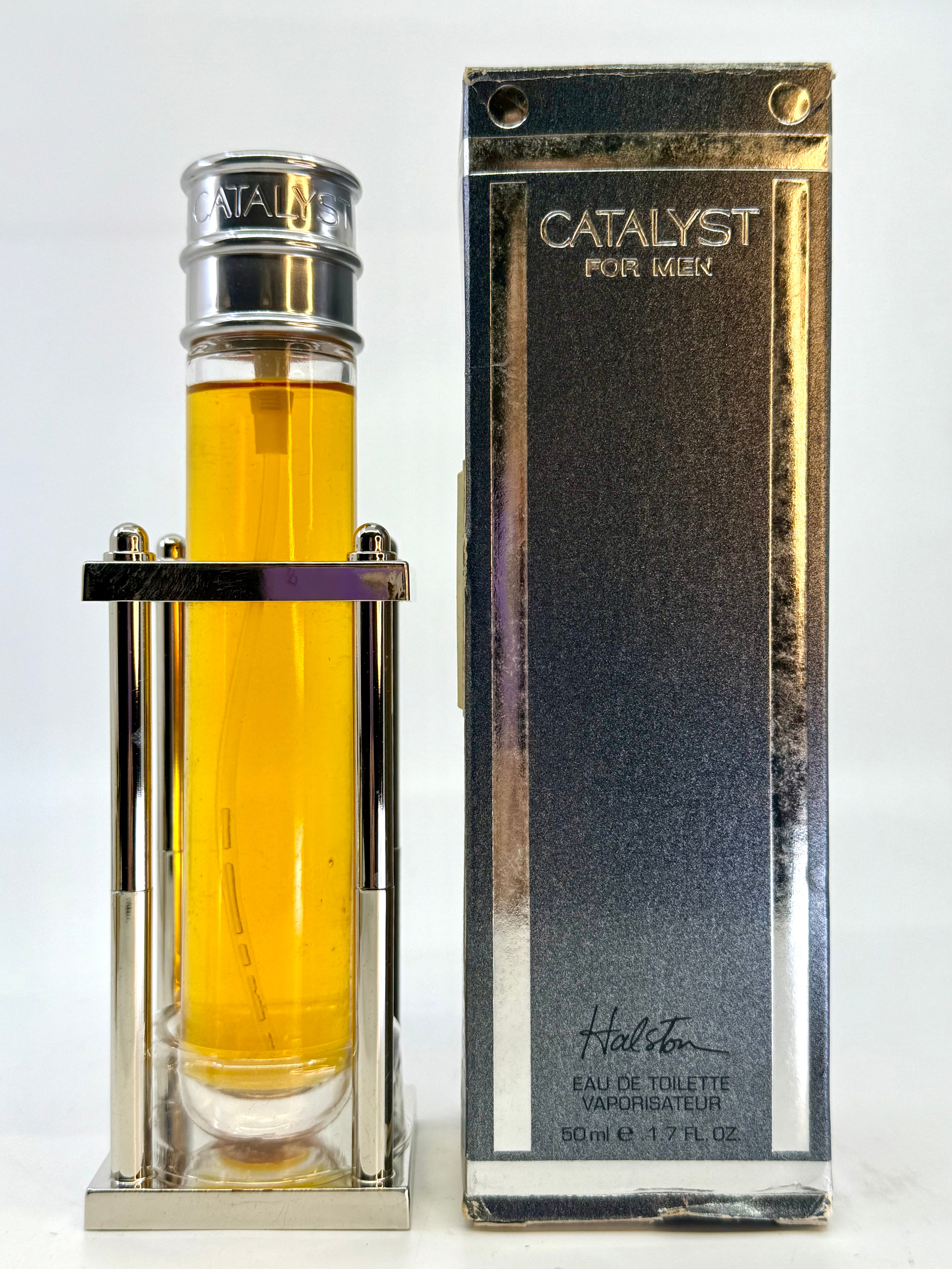 Catalyst by Halston is a 1994 release by perfumer Ilias Ermenidis and Harry Fremont. This Aromatic Fougere fragrance has an aromatic profile of fresh spicy, aromatic, warm spicy, green, woody, citrus, amber, floral, herbal, and powdery notes. This fragrance is now discontinued and very rare.
