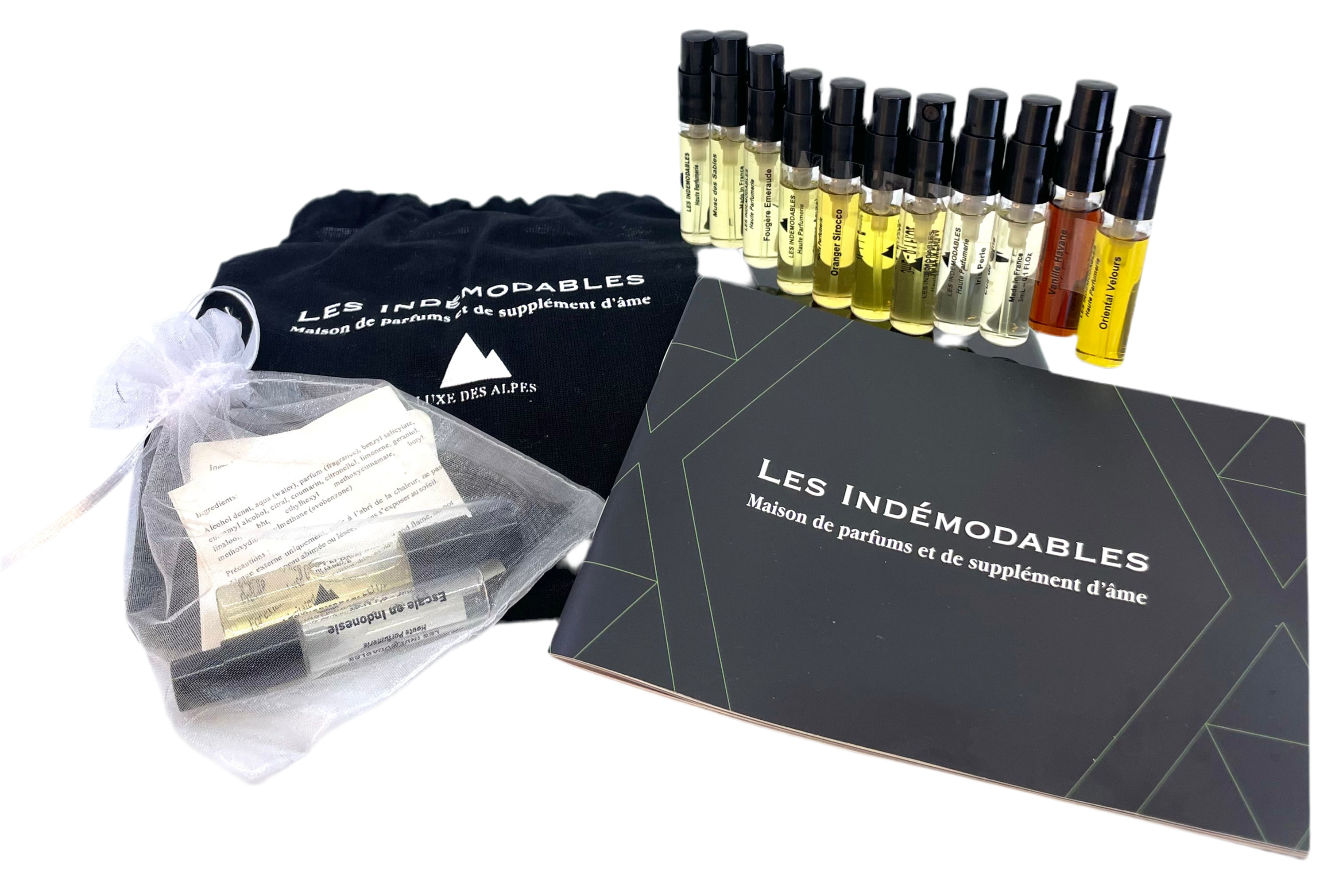 Sample the entire Les Indemodables collection of thirteen 3ml spray bottles in a cotton pouch accompanied by a booklet describing the collection. Note: Boxed version currently not available. Discovery set comes in a branded chic and sustainable black cotton bag.